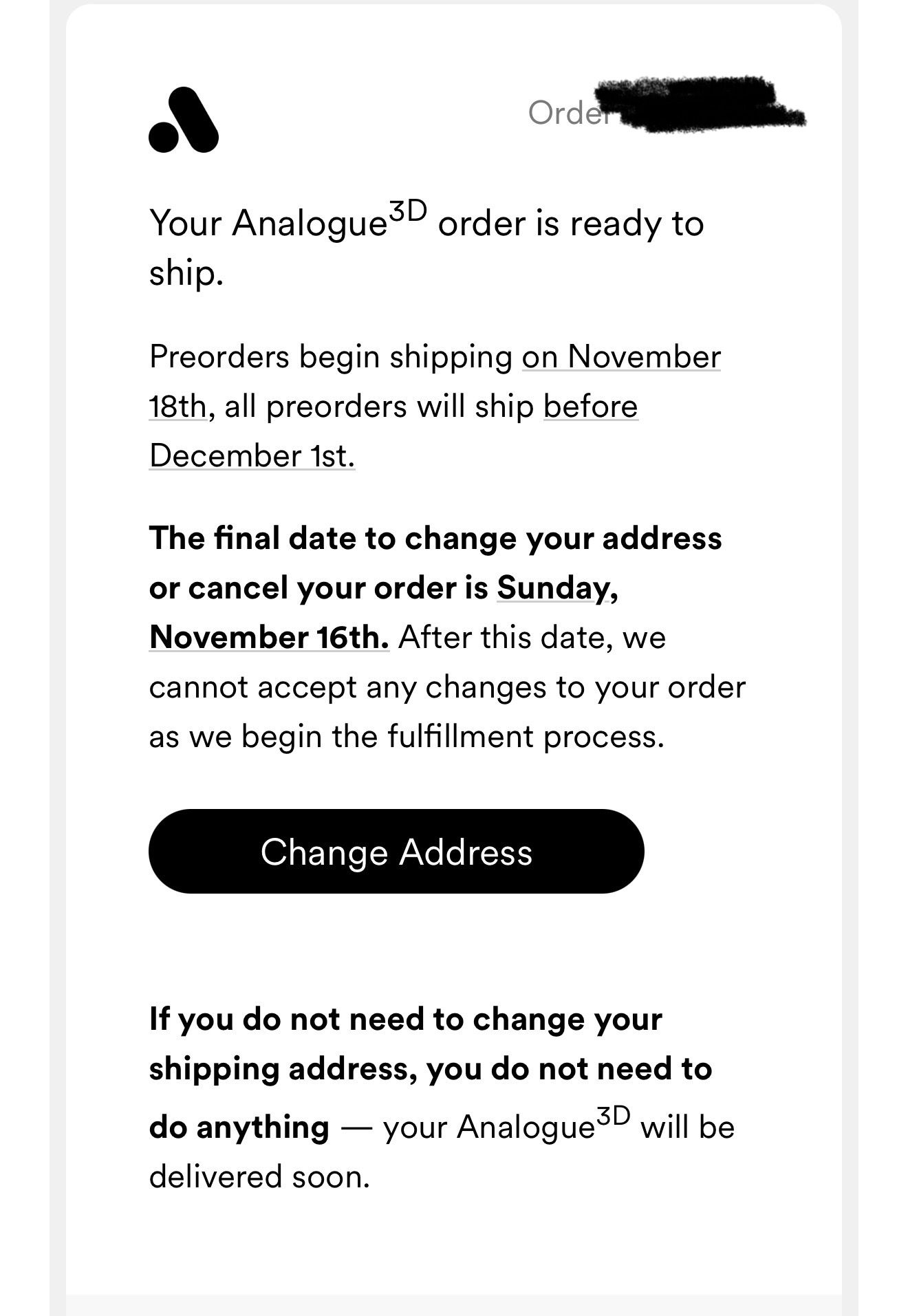 Here's an email we received confirming that we have until November 16th to change our address before shipping. It's all happening, and Analogue have confirmed that all pre-orders will be shipped before December 1st. That's a little later than November 18th, but it's better than nothing!