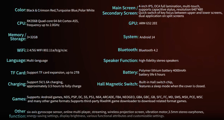The RG DS seems to be powered by a Rockchip RK3568 chipset and 3 GB of RAM, with an ARM G52 GPU and 4000 MAHs of battery.