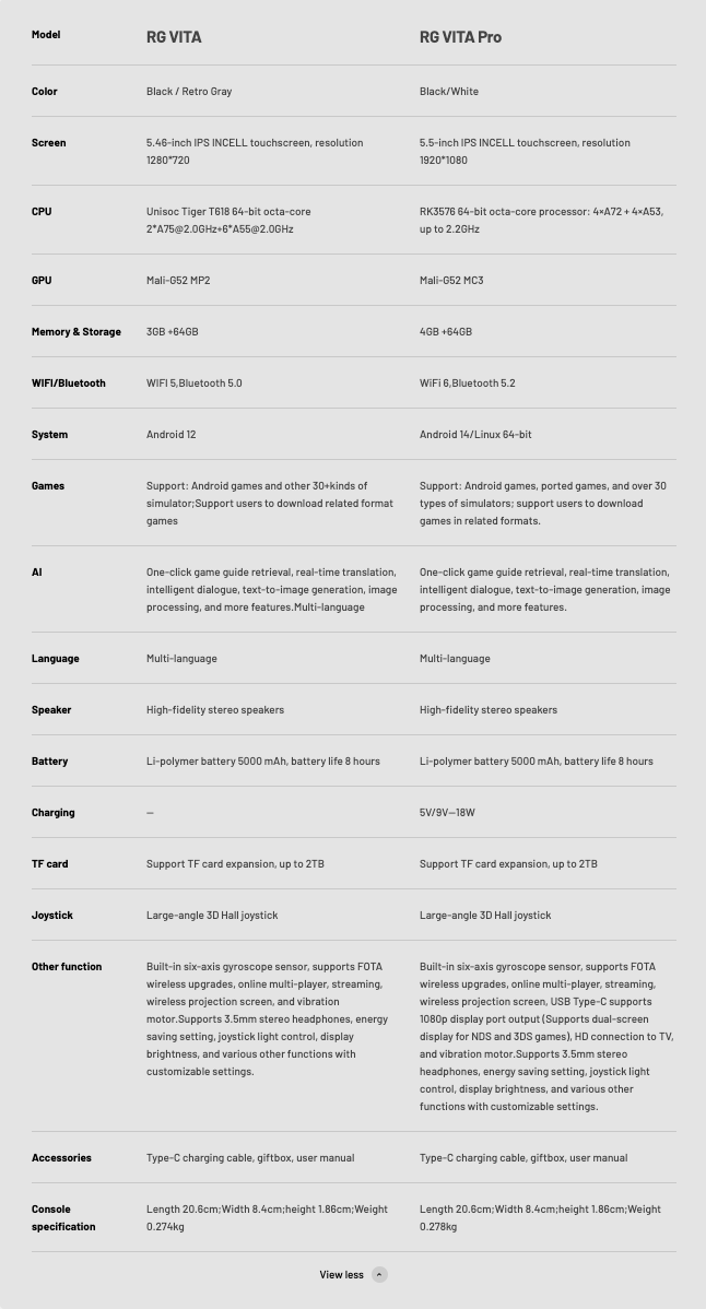 ANBERNIC RG Vita & Vita Pro Specifications