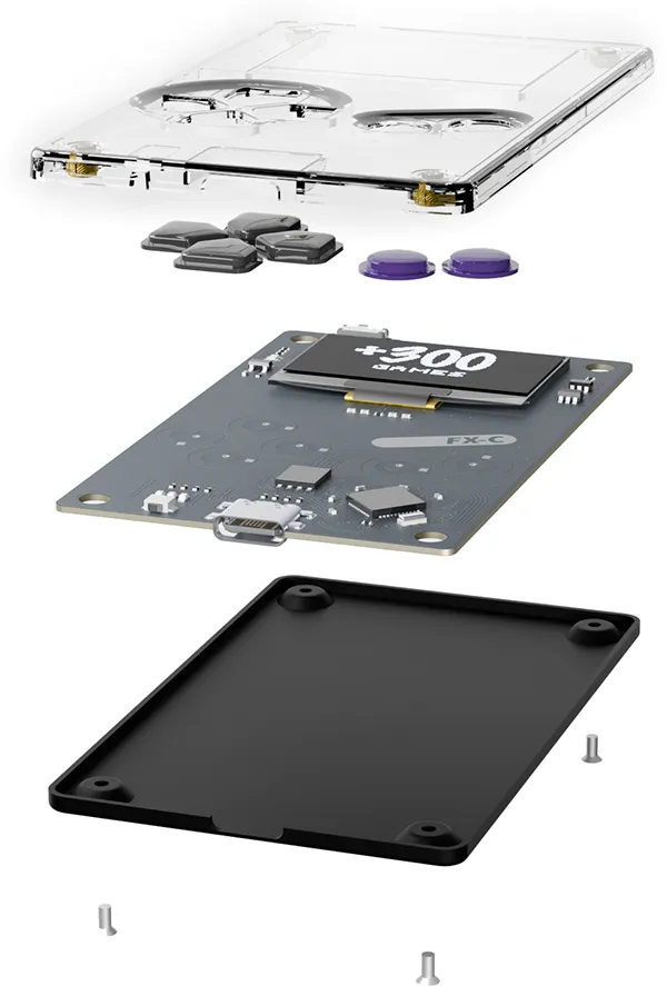 The FX-C comes with a USB-C Charging port, 300 pre-installed games from the talented Arduino community, and the ability to connect to another FX-C to access multiplayer games.
