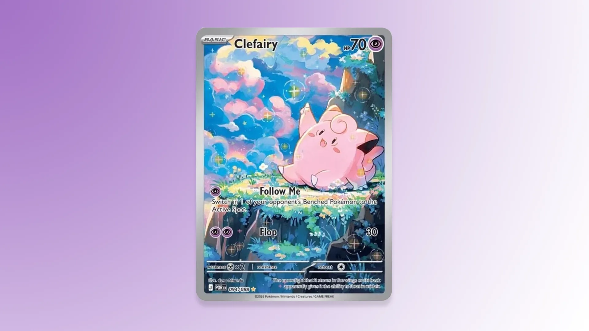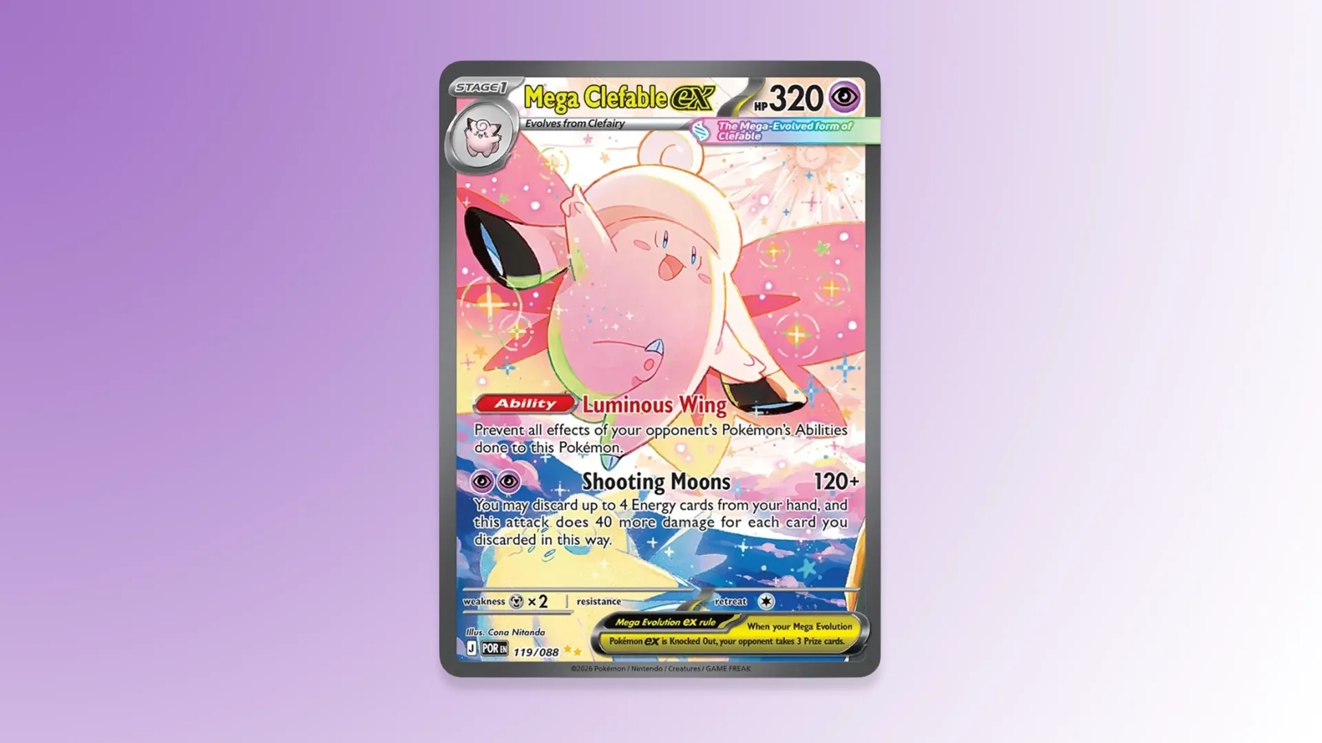Now, this is just a personal opinion, but this is one of the most stunning cards of the set, a Mega Clefable dancing amongst the magical rays, with big, bold, pink wings and a darker, glow-in-the-dark version of itself in the reflection. What a beauty.