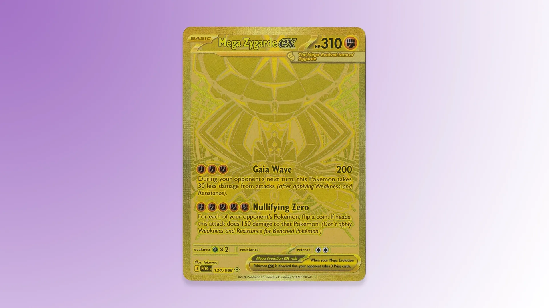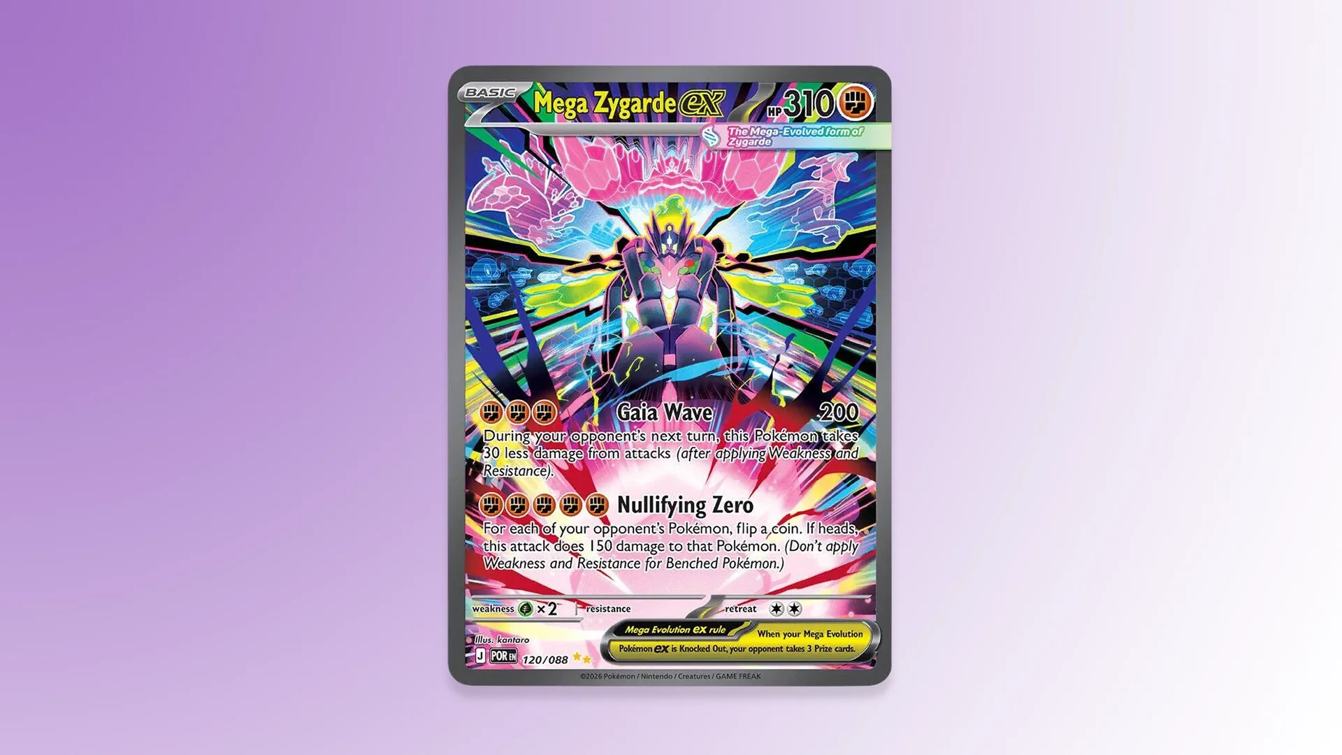 Should you be lucky enough to pull it, this stunning, and incredibly shiny card shows Zygarde in its Mega Forme, holding a canon-like weapon above its head, as witnessed in Pokémon Legends: ZA.