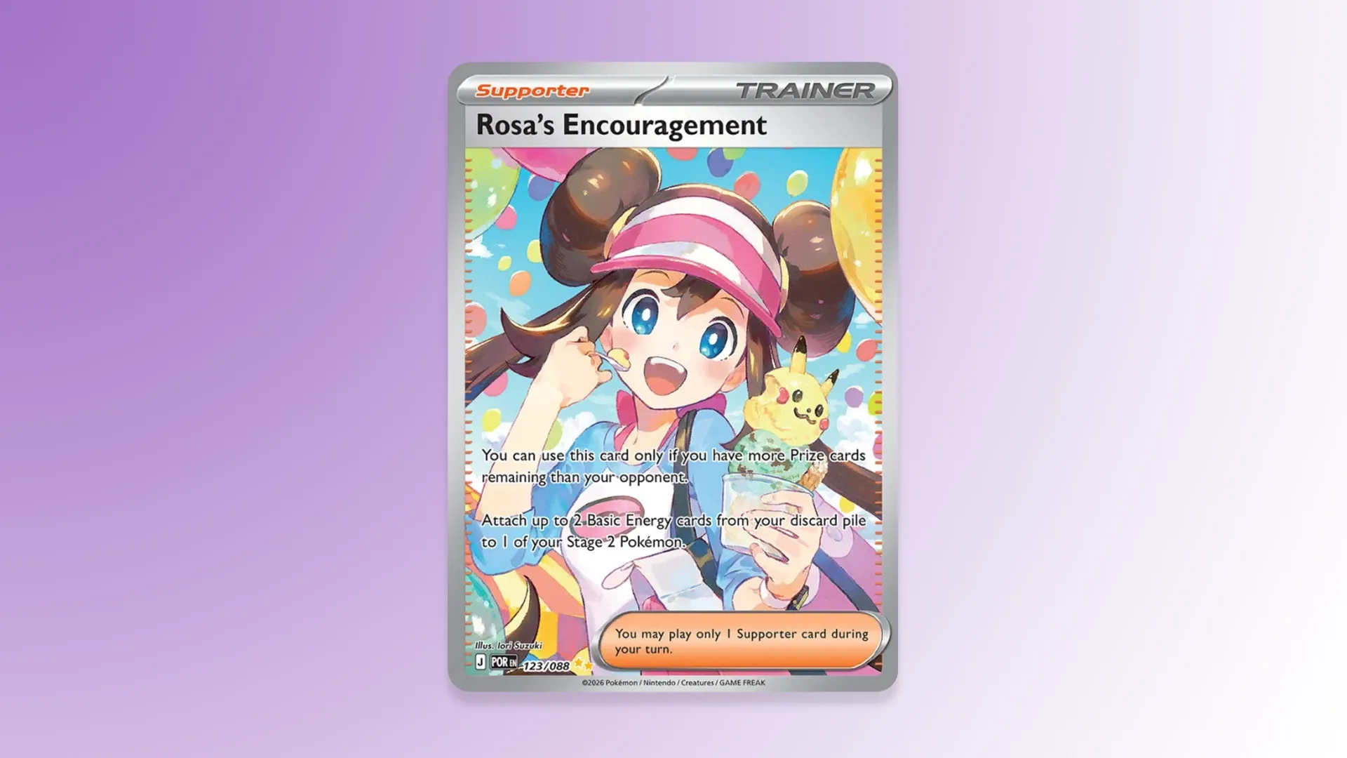 The first Trainer card of the list is Rosa's Encouragement, in a bright and bubbly illustration. Rosa is the protagonist in Pokémon Black and White Version 2.