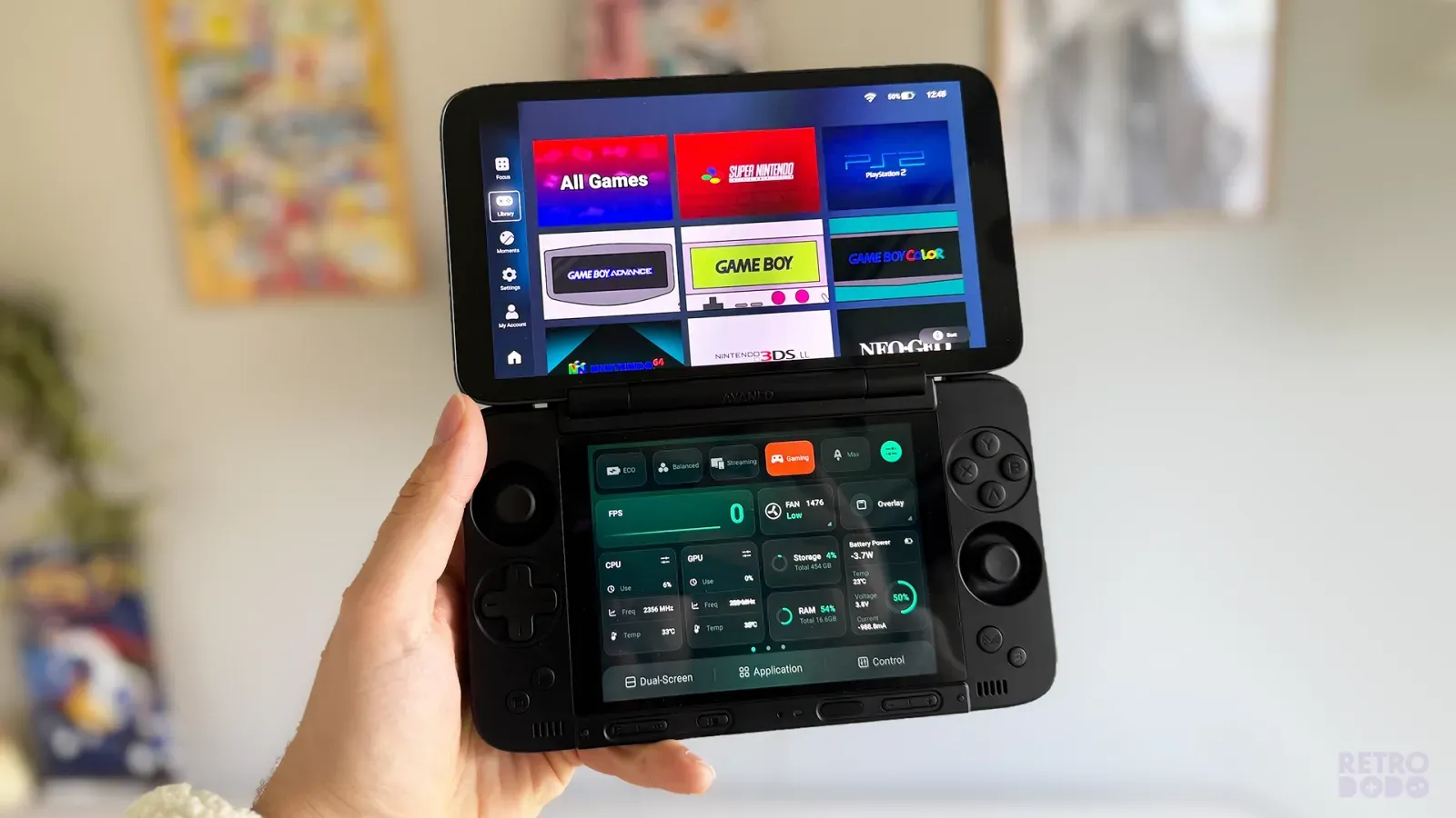 The AYANEO Pocket DS features a 7" OLED top screen, bigger than the rest on this list and a 5" 4:3 LCD bottom display that can show your performance metrics, or be used to multi-task.