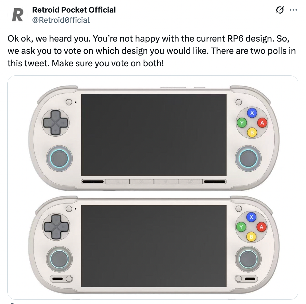Secondly, GoRetroid's impeccable social team shared a post asking what design users would prefer, removing the M1/M2 buttons on the chin and replacing them with buttons around the screen.