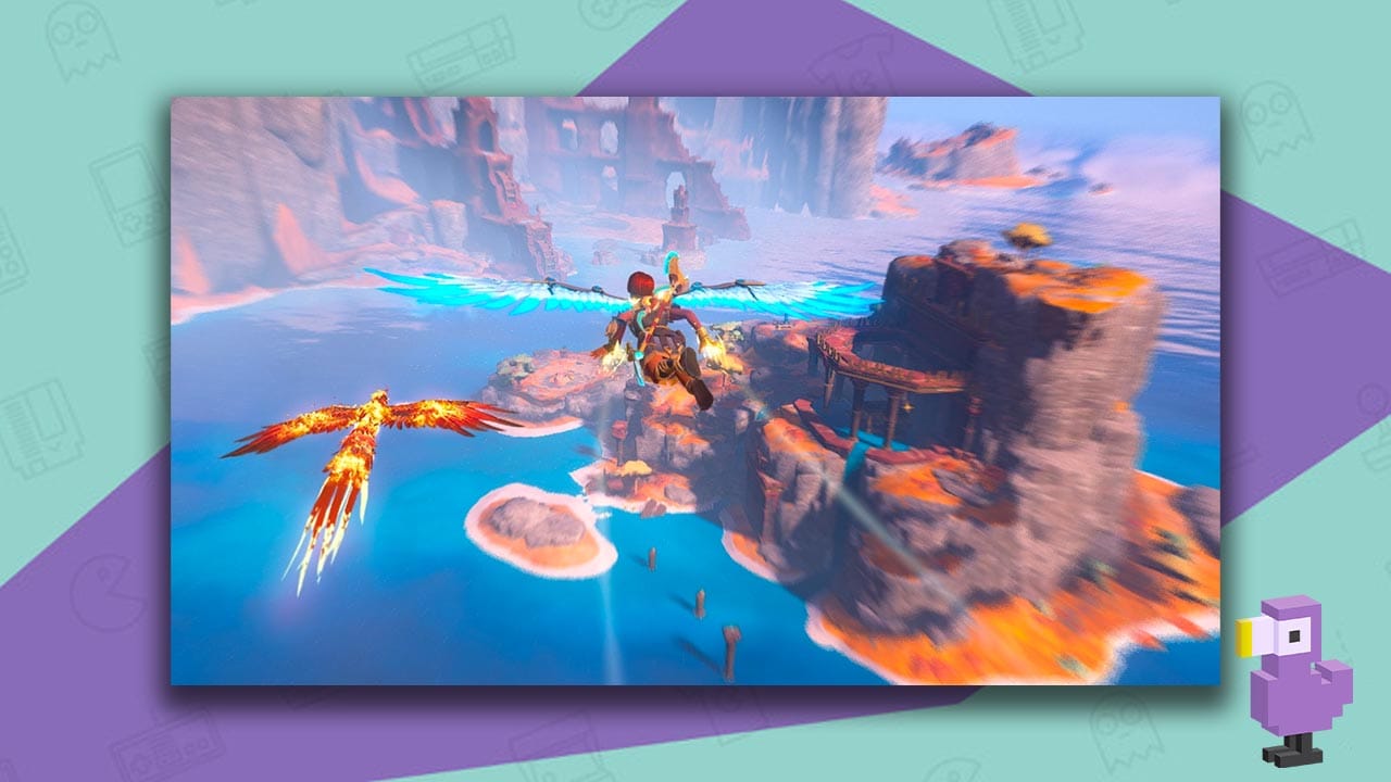 Like TotK, this is an open world game where flying plays a big part in the gameplay. Like the Wings in the new Zelda game, Fenyx van cover great distances using her wings, reaching new areas and speeding things up a bit in the process.