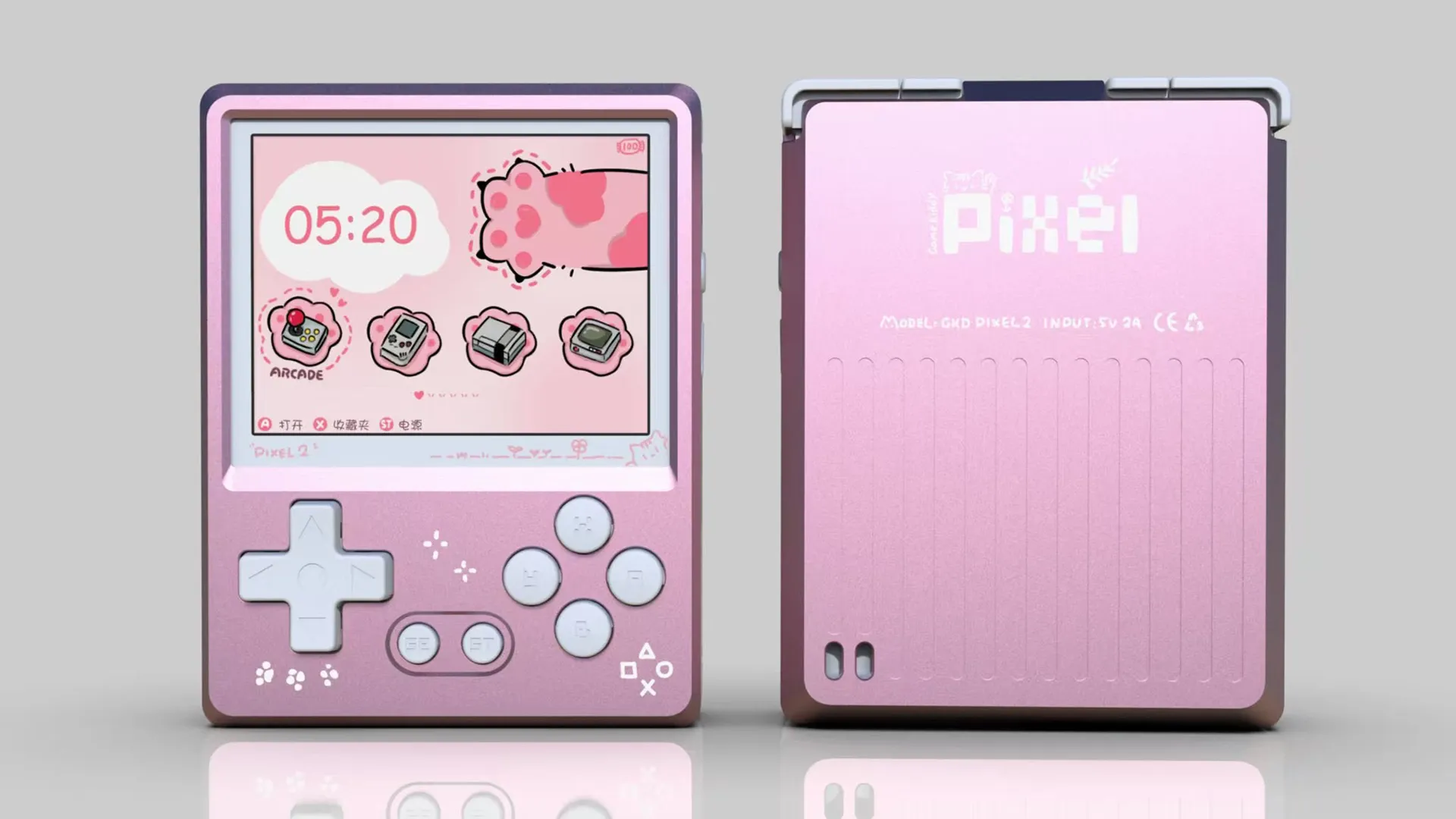 The new Pink shell gives the GKD Pixel 2 a refreshingly bright overhaul, with bright white buttons to match, alongside some tiny detailing around the device, featuring what could be paw prints, bubbles, the action button shapes loved by PlayStation fans and a kitty-themed border around the display.
