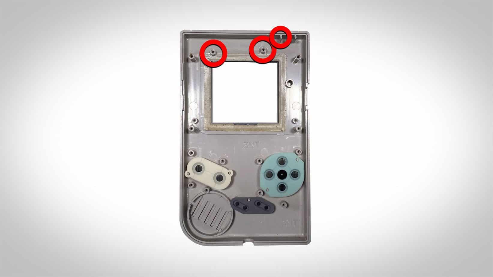 In the image above, clip off and then sand down the circled screw points at the top of the shell. You may have to clip one of the 3 “lines” in the top right corner too. All we need to do now is to insert the new drop-in display onto your shell.