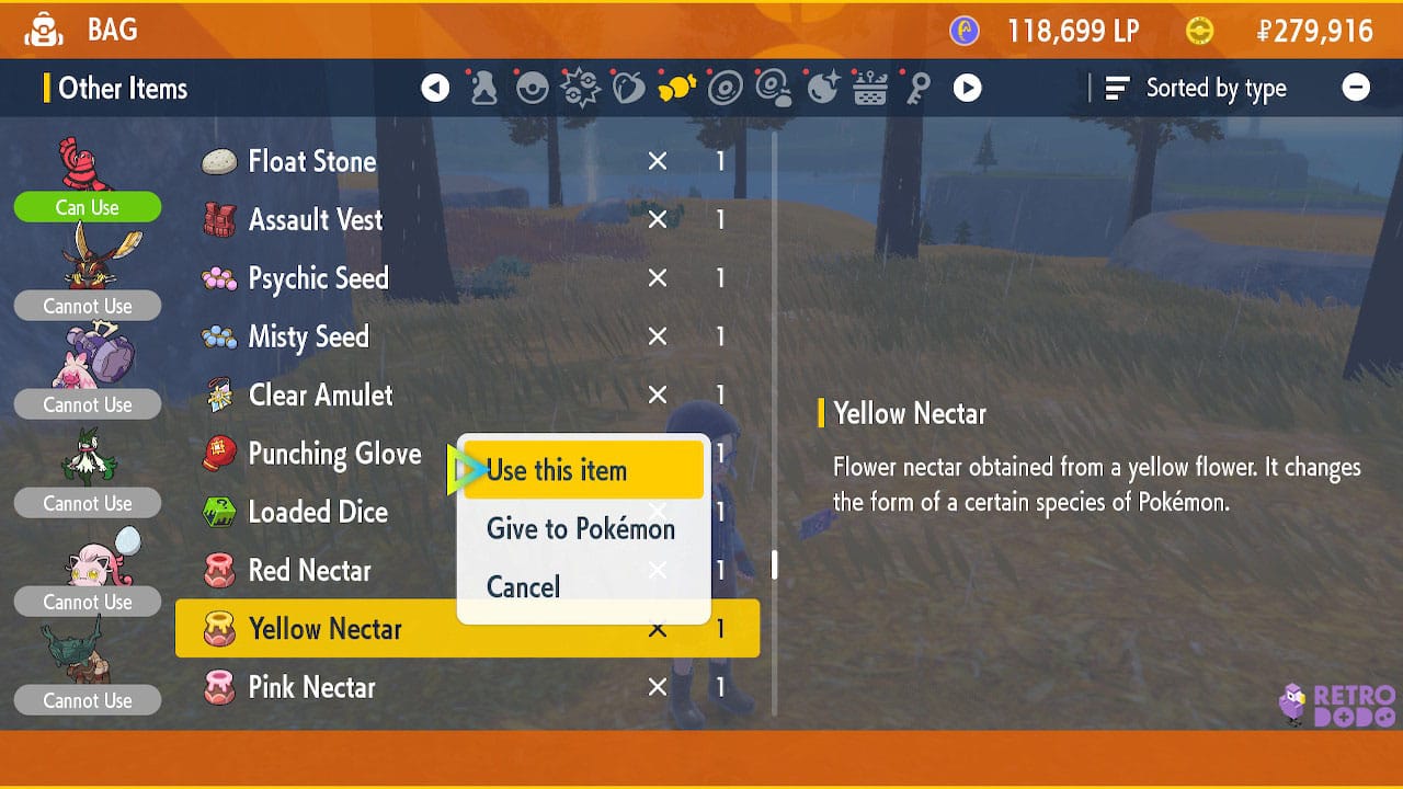 Once you have your nectars, add Oricorio to your party (assuming it isn’t already), then open your Bag to select which nectar you want to use.