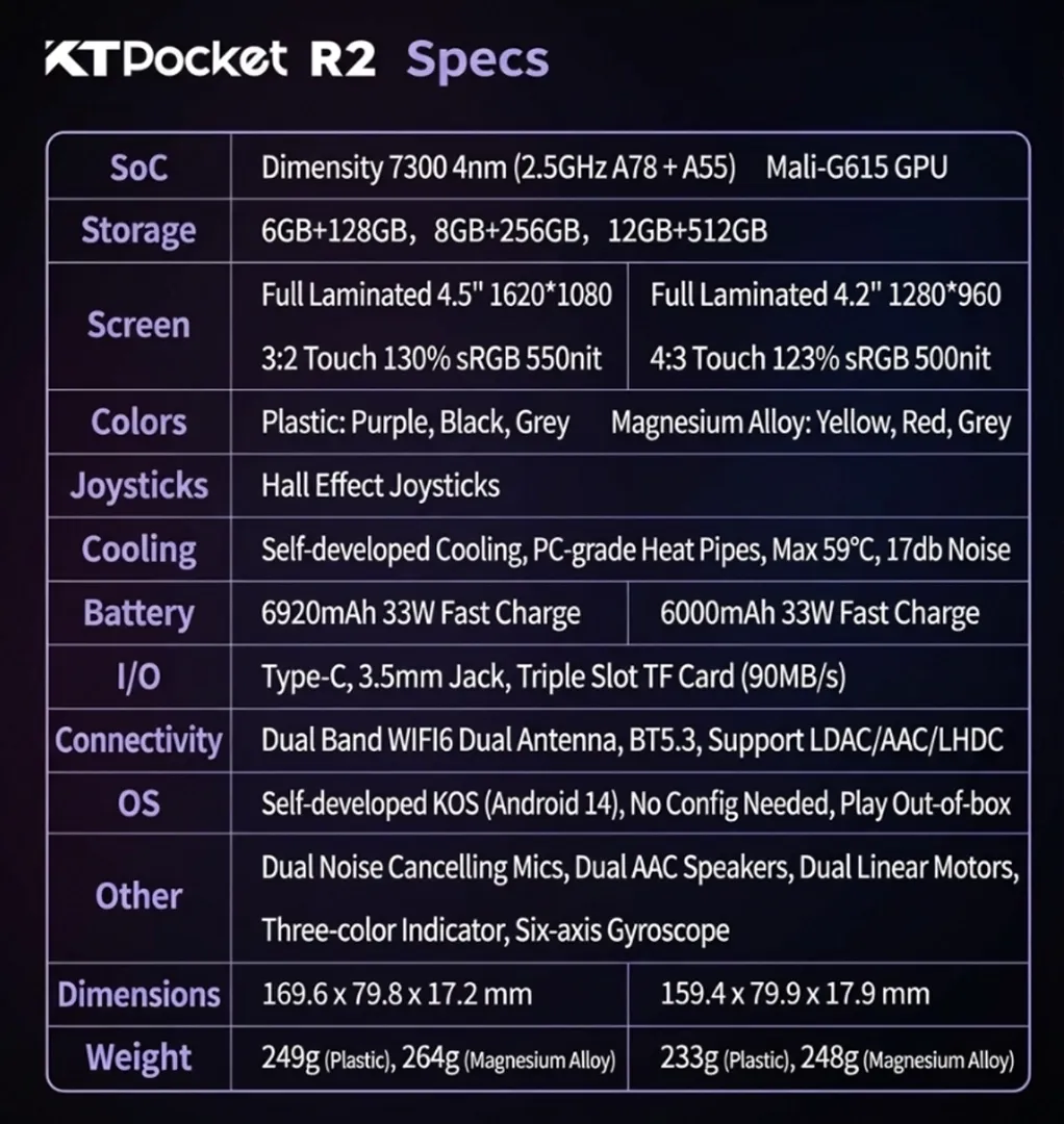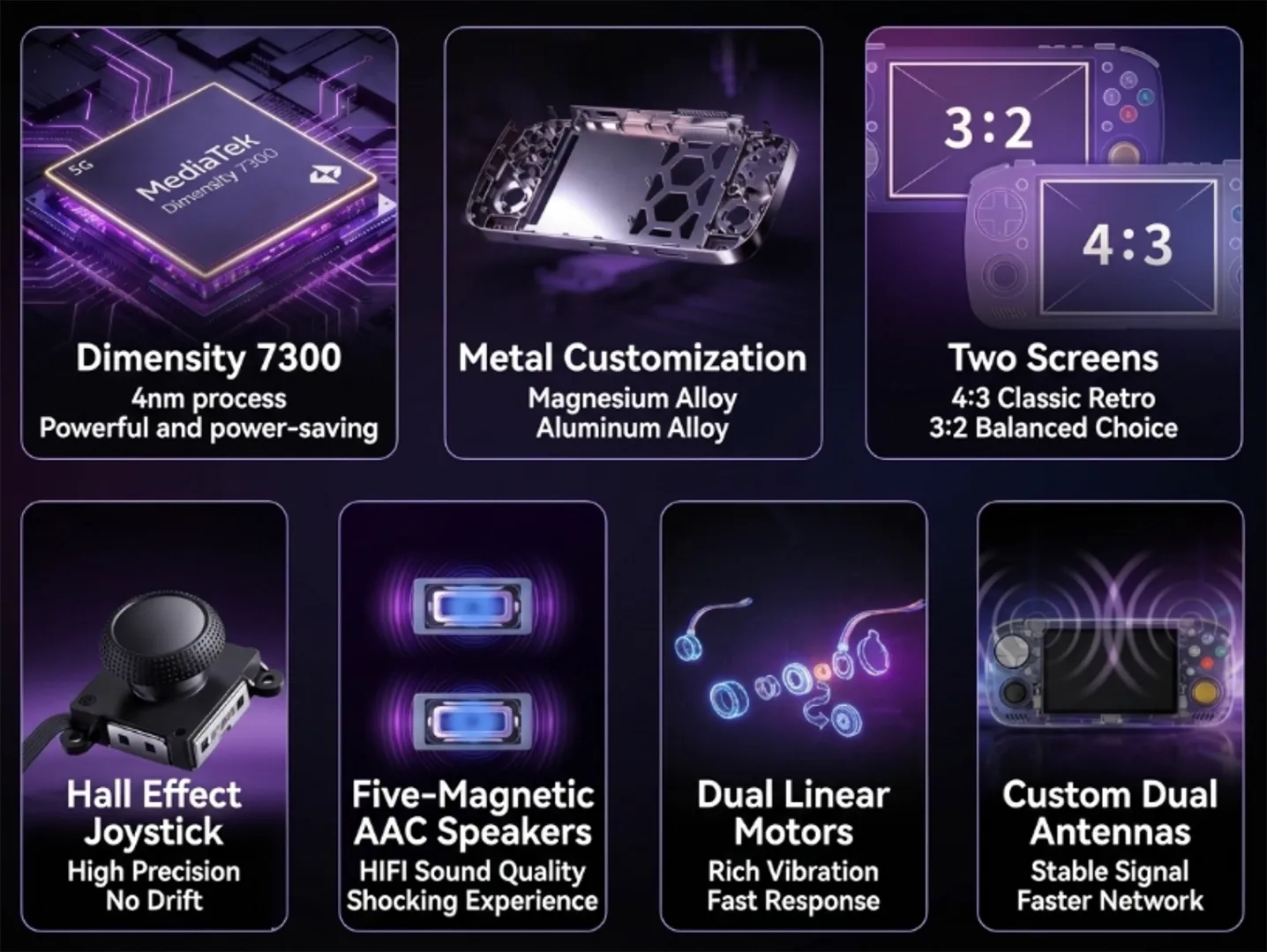 It features a MediaTek Dimensity 7300 CPU, a Mali‑G615 GPU, a choice between a 4:3 (4.5" 1620 x 1080) or a 3:2 display (4.2" 1280 x 960), a 6000-6920 MAH battery capacity, hall-joysticks, and in-house cooling.