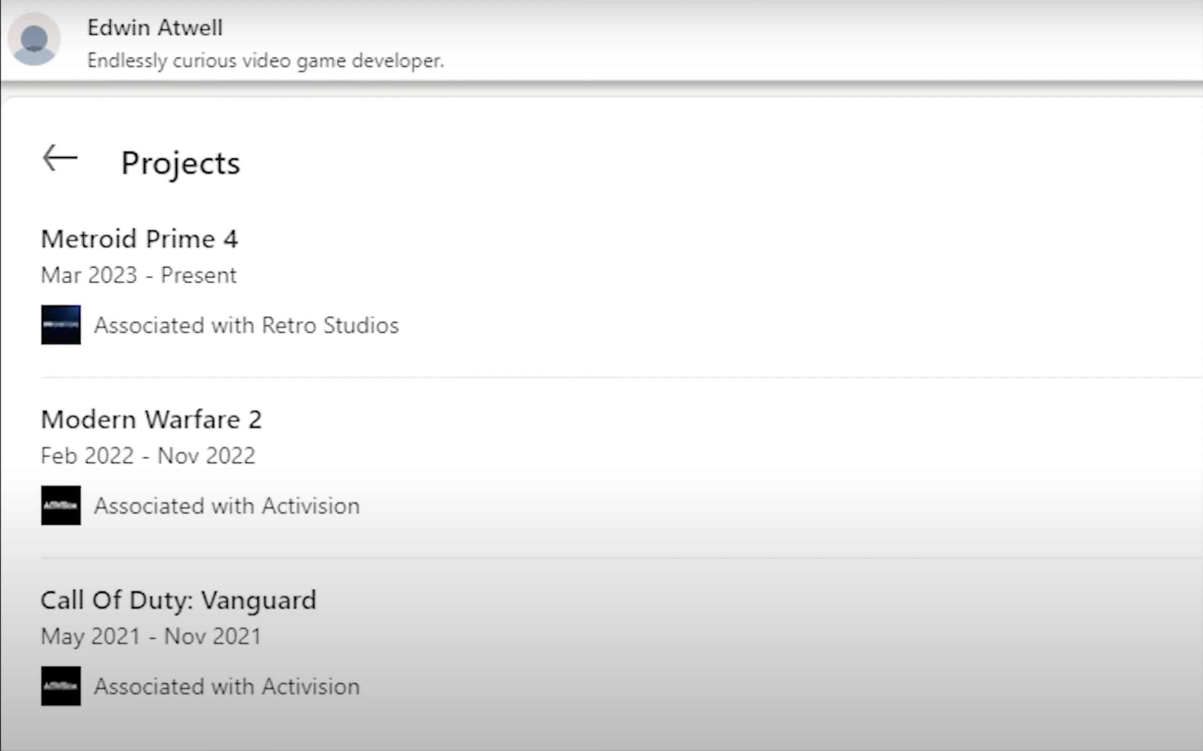 Note the time frames working on each of those Call of Duty games too – 7 and 9 months respectively working from the bottom up. Obviously, it would be nice to think that Metroid Prime 4 would also follow that same game testing pattern, but with the wait we’ve had so far, who knows how long Edwin could be testing this for.