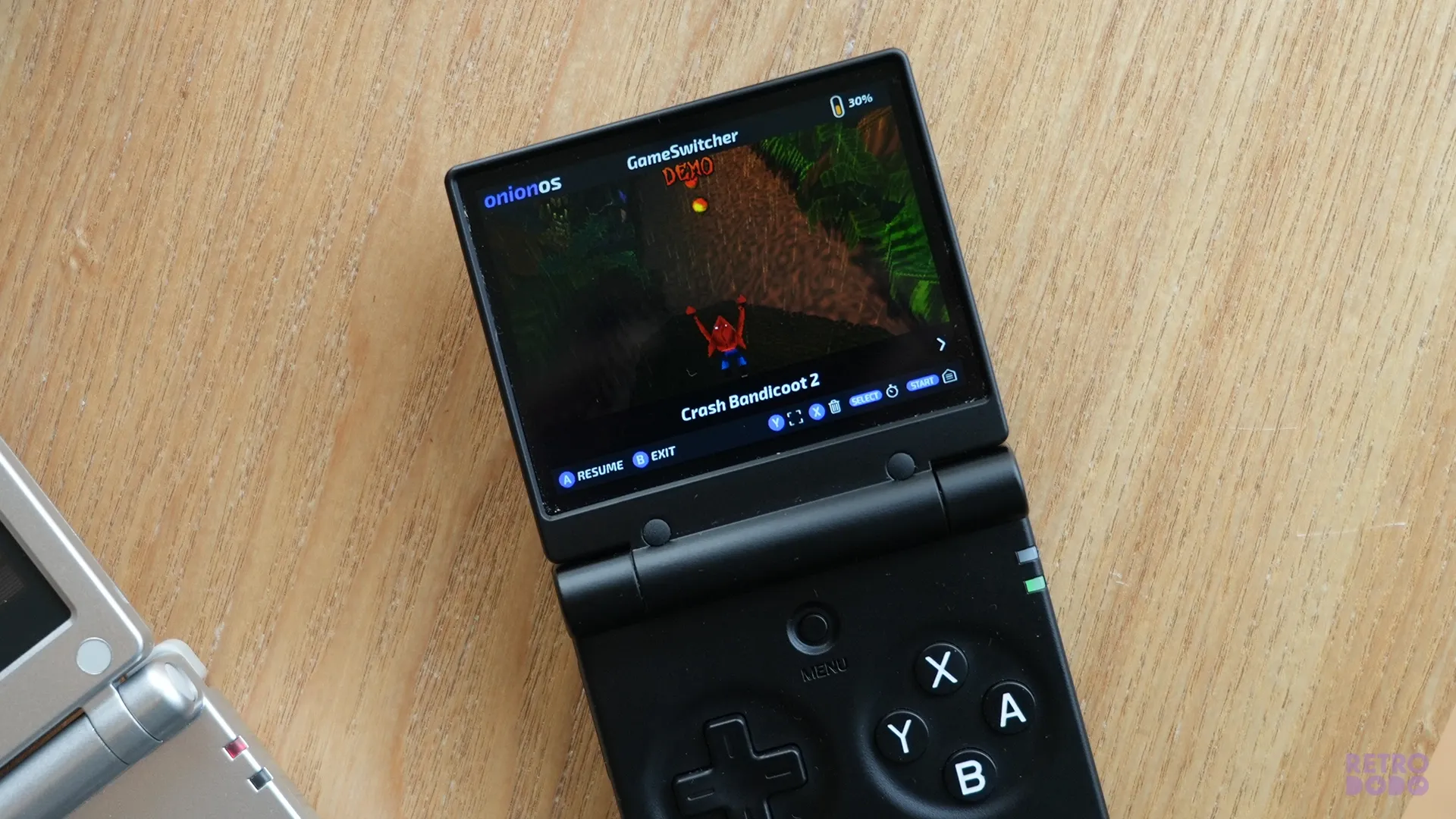 On the much thicker base, you'll find your menu button, which opens up Onion's menu that allows you to skip to other games quickly, open up settings or jump back into your gaming library.