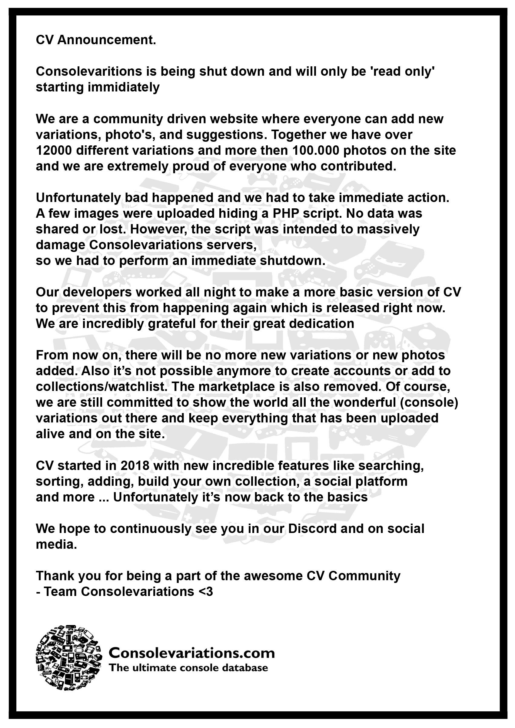 Don's community are already stepping in offering donations and help to get this back up and working again. Don's focus is on working with his developers to get things back to normal as quickly as possible, and we, too, hope that he can. We highly recommend following ConsoleVariations on socials to keep updated with the progress.