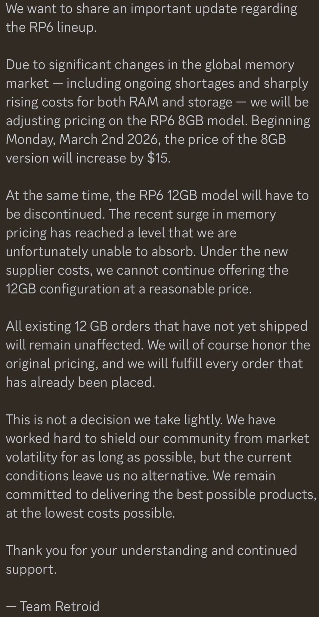 It's sad to see, but I guess it's not Retroid's fault; it's simply due to the fact that the boom in AI is causing an increased demand for RAM and storage, which pushes the prices up significantly.