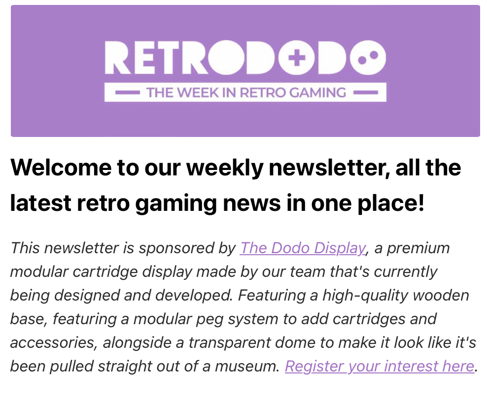 Retro Dodo is one of the world's leading sources for retro gaming news, reviews and videos, with over 500,000 followers and 50,000,000 readers since founding.
