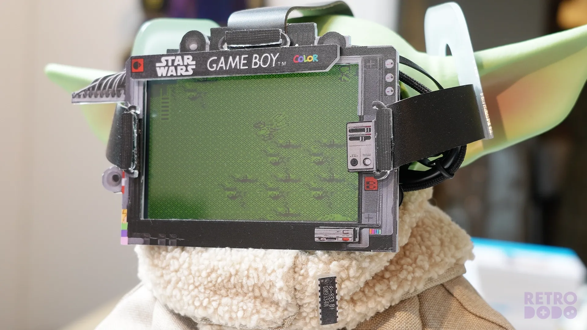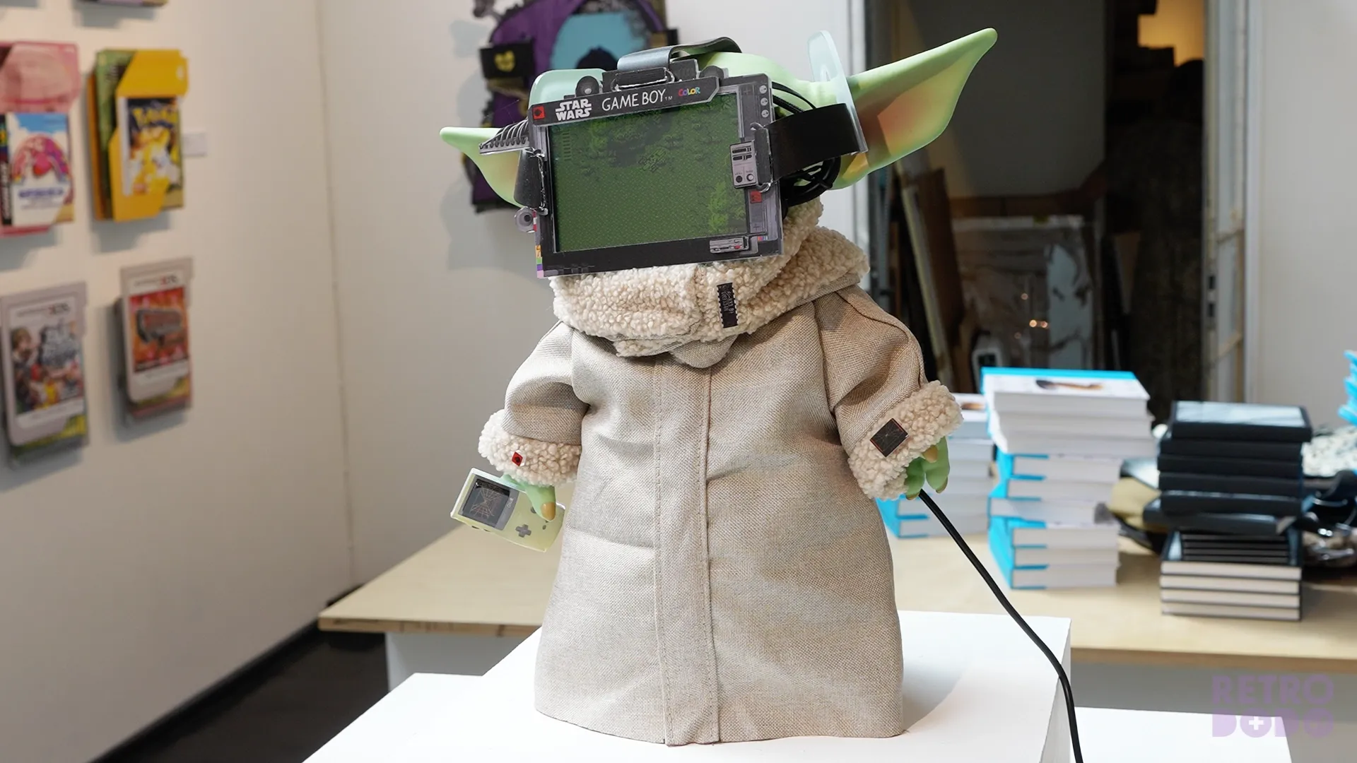 Then on the other side, a toy Grogu who has faced a similar fate to the poor Care Bear. Grogu can be seen with his face cut off and a display strapped to it featuring the original Star Wars game on GAME BOY a game that I am familiar with. Grogu can even be seen holding a small GAME BOY too.