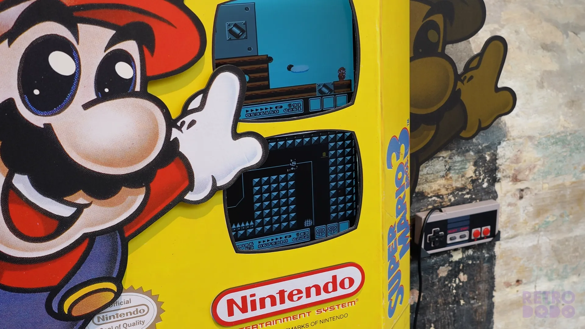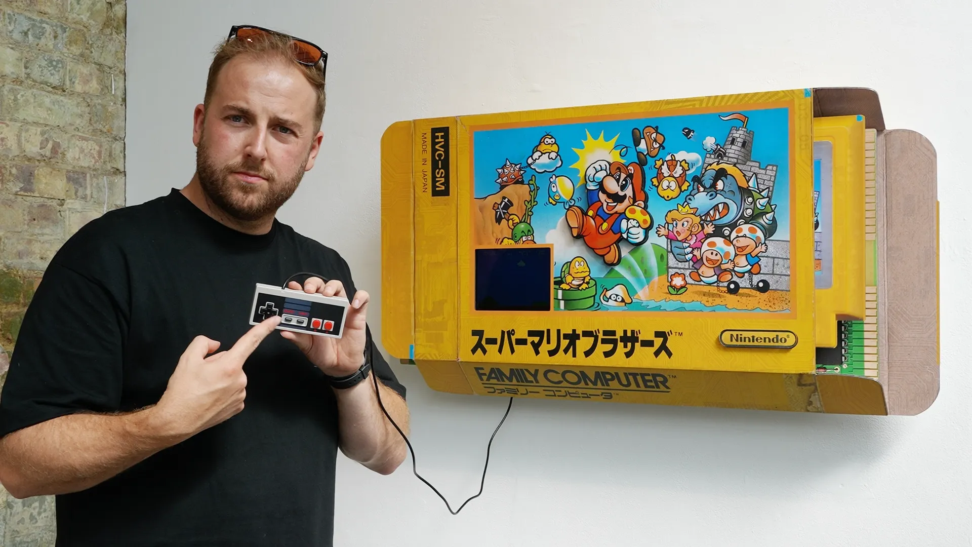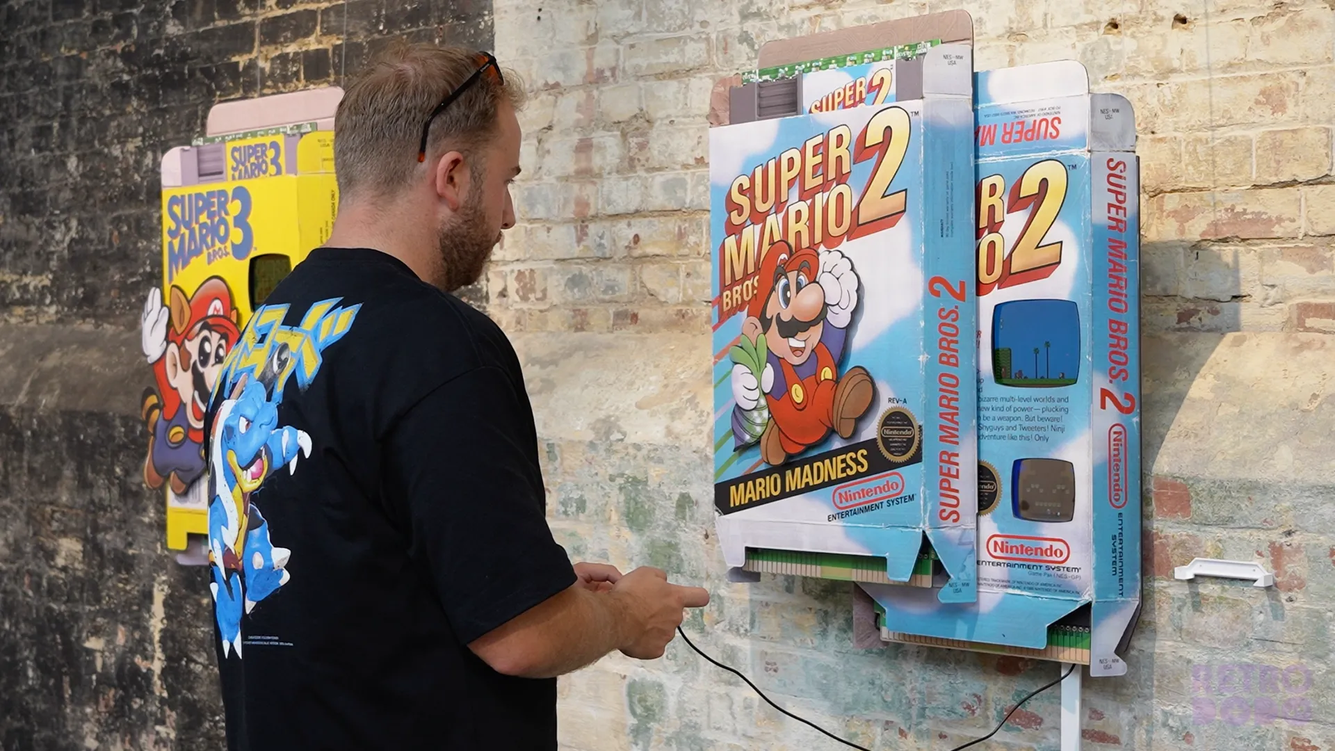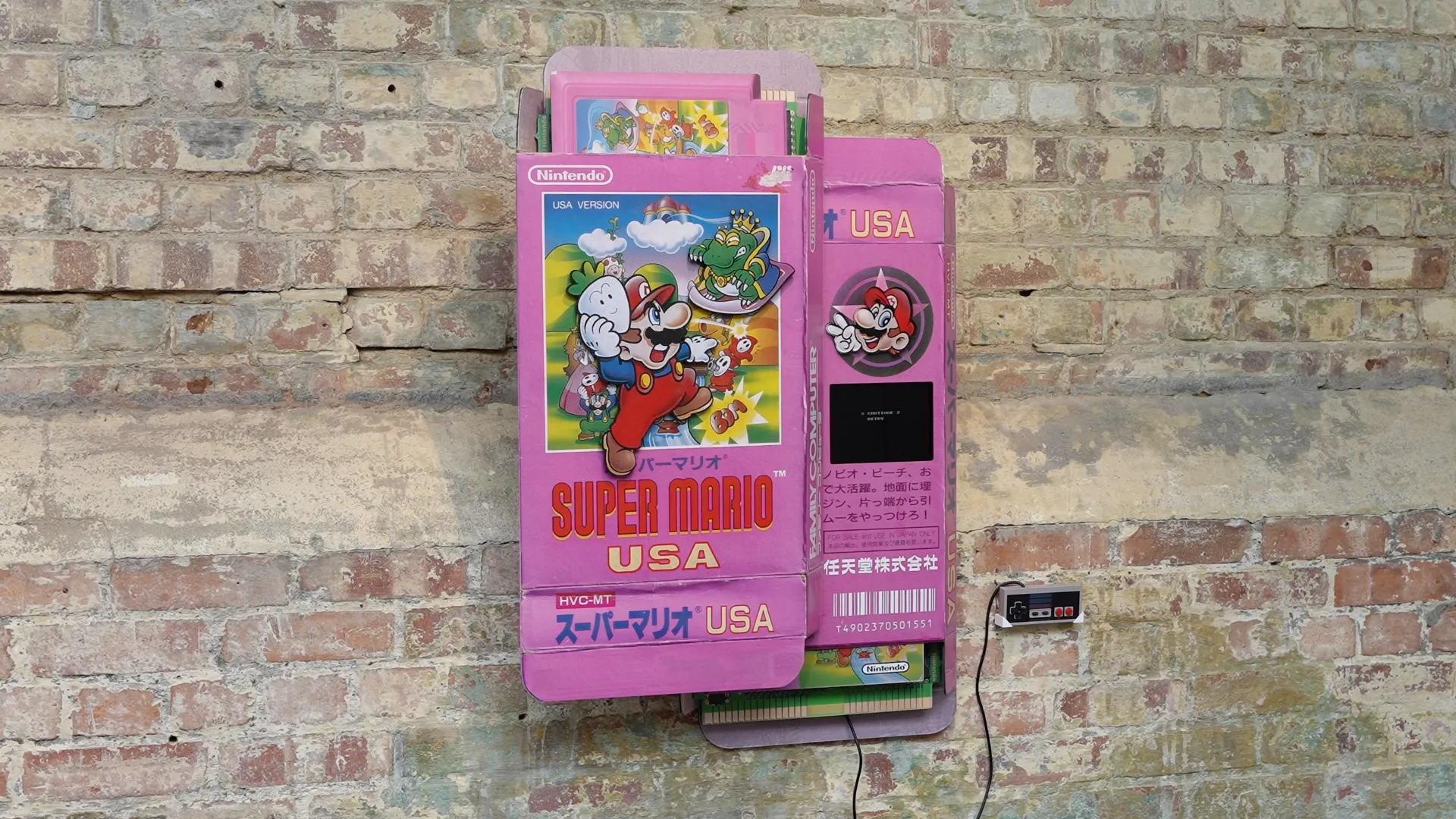 The first piece I came across was the largest of the bunch, featuring the Japanese Super Mario Famicom Box. This design, like the rest, features the box opened up, with a sneak peek at the cartridge and a motherboard to make it look like a working games console… which it is, allowing viewers to experience the original Super Mario Bros game.