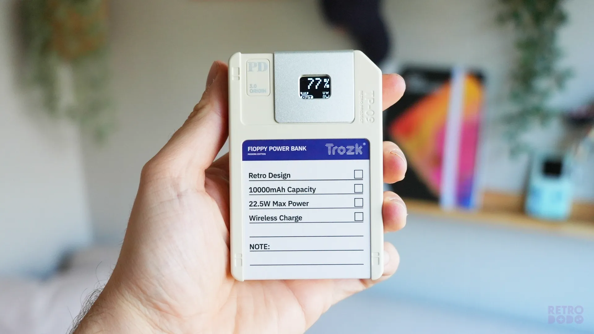 It's a modern battery pack with easy-to-use features, MagSafe technology, and a 0.66" display, all wrapped up into a Floppy Disk design.