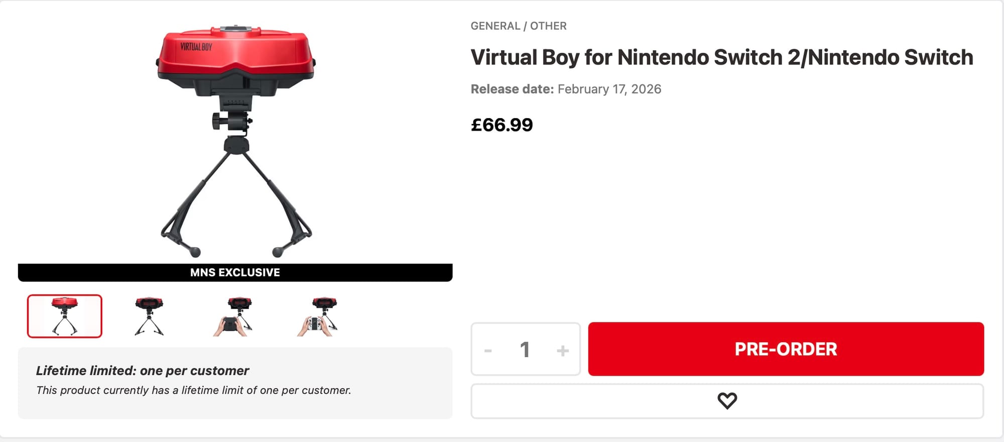 Back in September, I wrote about the back catalogue of Virtual Boy games arriving on the Nintendo Switch Online platform on February 17th, 2026. Now we're in December and that arrival date is coming around fast, and Nintendo has finally made their Virtual Boy Accessory available for pre-order, so we can get ready for the big day.